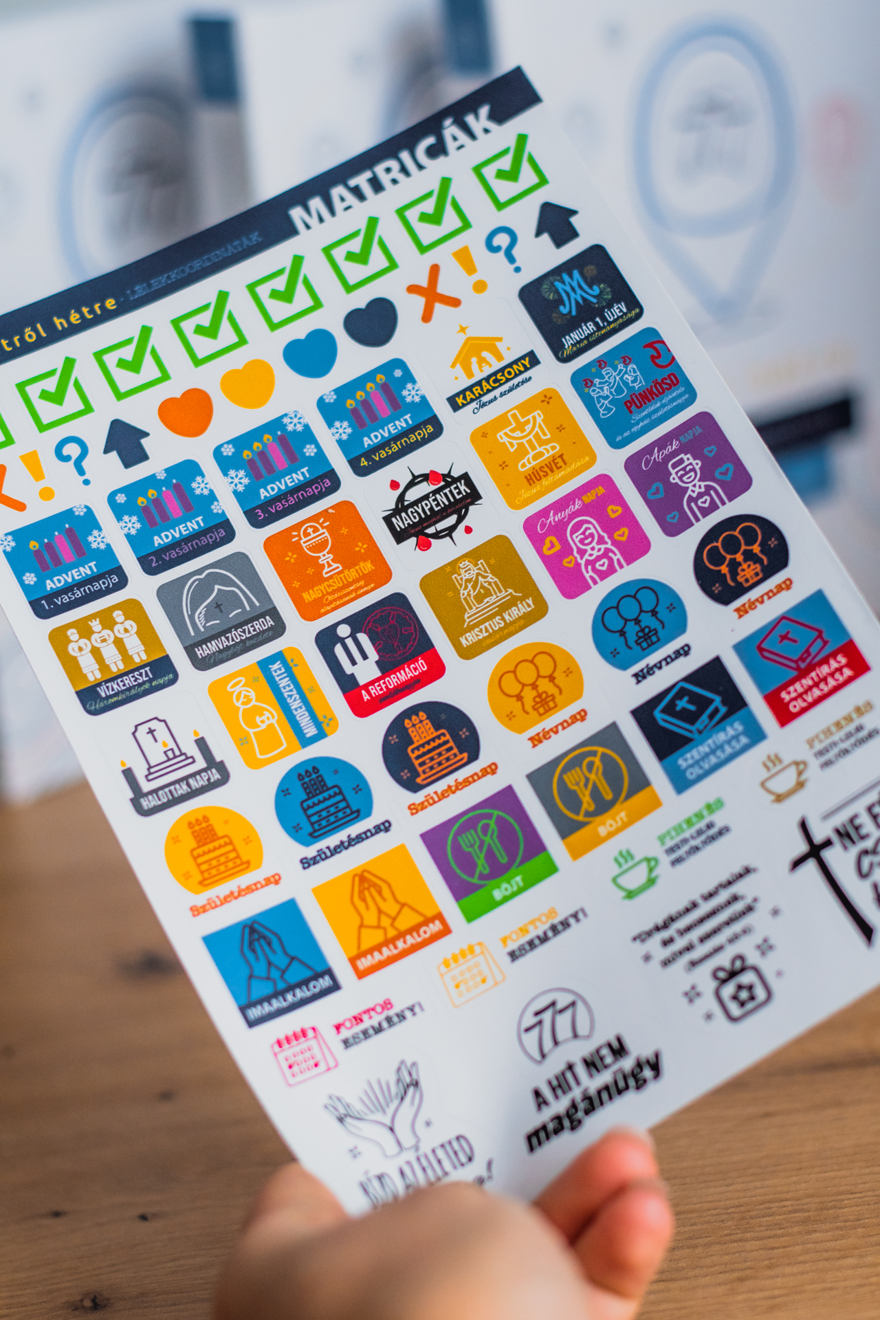 A matricák között megtalálhatók az egyházi év fő ünnepei (pl. advent, karácsony, húsvét, pünkösd), lelki alkalmakat jelölő ikonok (ima, böjt, szentírás-olvasás), valamint általános, a mindennapokhoz kapcsolódó jelölések (születésnap, névnap, fontos esemény). Így egyszerre segítik a tervezést és a lelki elmélyülést.