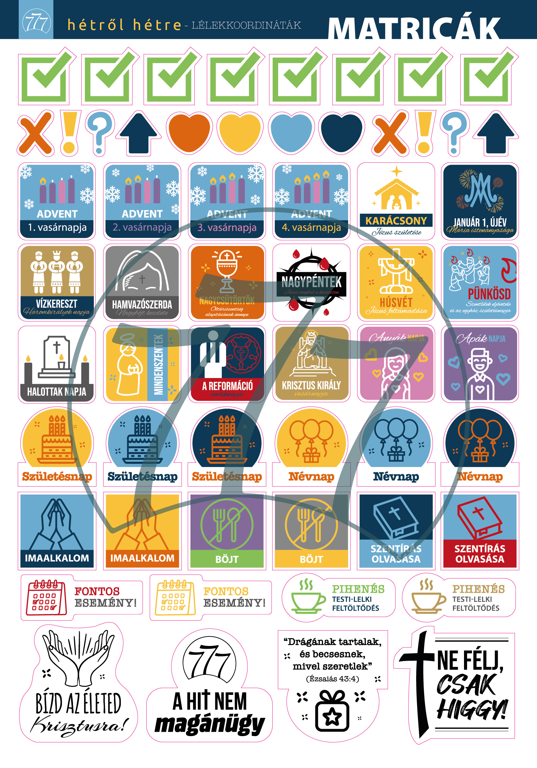 Ez a keresztény témájú matricakészlet segít, hogy a mindennapok szervezése közben is szem előtt maradjon a hit és a lelki élet ritmusa. Eredetileg a Hétről hétre imanaplóhoz készült kiegészítőként, de önállóan is kiválóan használható bármilyen határidőnaplóban, jegyzetfüzetben vagy imanaplóban.